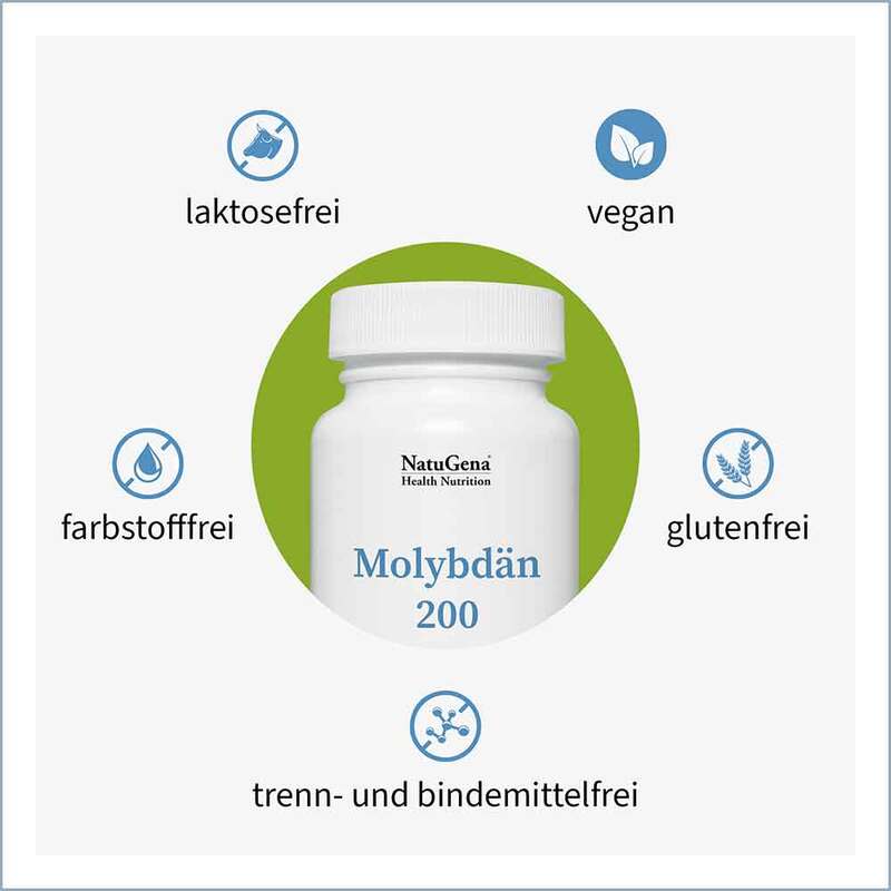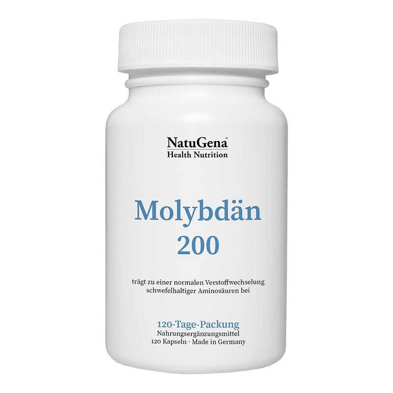 NatuGena Molybdän 200 liefert pro Tagesdosis 200 µg des essenziellen Spurenelements Molybdän. Dieses trägt zur normalen Verstoffwechslung schwefelhaltiger Aminosäuren im Körper bei. Da Molybdän nicht selbst gebildet werden kann, ist eine regelmäßige Zufuhr über die Ernährung erforderlich. Die Anwendung wird unabhängig von Mahlzeiten empfohlen, um eine bestmögliche Aufnahme zu unterstützen. Die Verpackung reicht für 120 Tage.