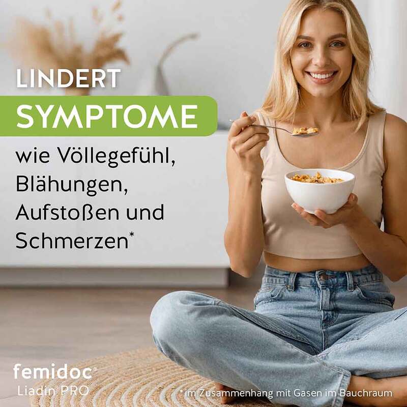 femidoc® Liadin® PRO Reizdarm-Syndrom Kapseln sind ein Medizinprodukt, das die Symptome einer übermäßigen Gasansammlung im Bauchraum und die damit verbundenen Schmerzen bei Patienten mit Reizdarm- Syndrom (IBS) lindern kann, einschließlich Völlegefühl, Blähungen, Aufstoßen und Schmerzen im Zusammenhang mit Gasen im Bauchraum. Bislang gibt es keine Heilung für das Reizdarm-Syndrom. Die femidoc Liadin® PRO Reizdarm- Syndrom Kapseln lindern die damit verbundenen Symptome.