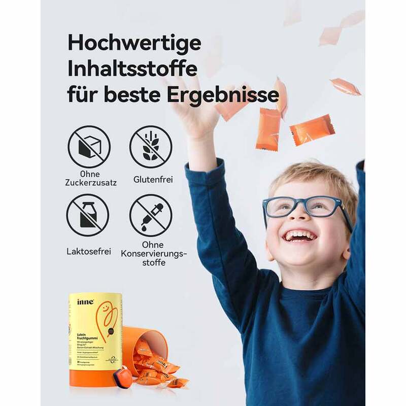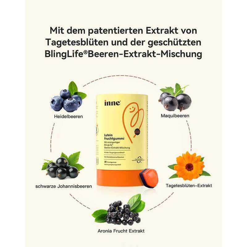 Süßungsmittel (Maltitsirup, Isomalt, Maltit, Xylit), Säureregulatoren (Citronensäure, Natriumcitrate), Verdickungsmittel (Pektine), Lutein- und Zeaxanthin-reicher Extrakt aus Tagetesblüten (Tagetes erecta L.), Schwarze-Johannisbeeren-Frucht-Extrakt (Ribes nigrum L.), Aronia-Frucht-Extrakt (Aronia melanocarpa (Michaux.) S. Elliot), Blaubeeren-Frucht-Extrakt (Vaccinium myrtillus L.), Heidelbeerensaft-Pulver (0,1 %), Vitamin E, Vitamin A, natürliche Aromen, mittelkettige Triglyceride, Überzugsmittel (Carnaubawachs).