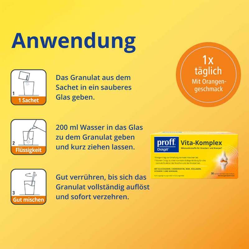 Das fruchtig-gelbe Granulat in praktischen Sachets stellt eine einfache Möglichkeit dar, den Körper täglich mit den benötigten Nährstoffen zu versorgen.* Mit dem erfrischenden Geschmack von Orange ist proff Dolgit Vita-Komplex nicht nur einfach anzuwenden, sondern auch angenehm im Gebrauch.
