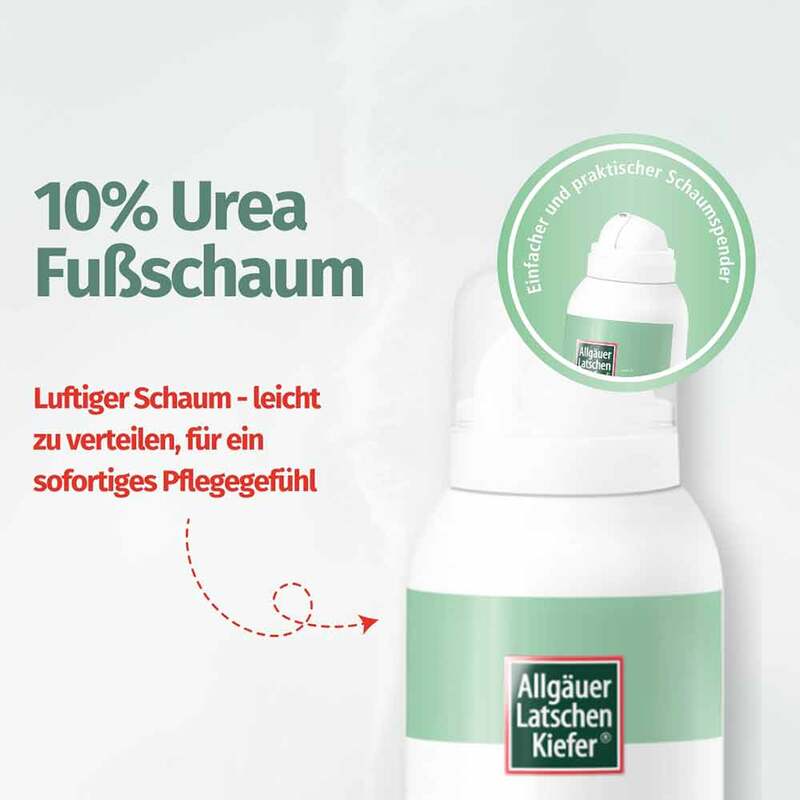 Unsere Füße tragen uns ein Leben lang durch jeden Tag und verdienen daher eine besondere Pflege. Der Allgäuer Latschenkiefer 10% Urea Fußschaum vereint wohltuende Pflege mit einem frischen Anwendungserlebnis. Der luftig-seidige Schaum mit angenehm-cremigem Duft hinterlässt ein geschmeidiges Hautgefühl und versorgt die Füße mit pflegenden Inhaltsstoffen.