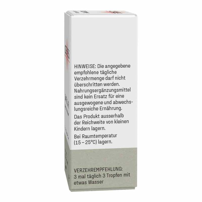3 mal täglich 3 Tropfen mit etwas Wasser.