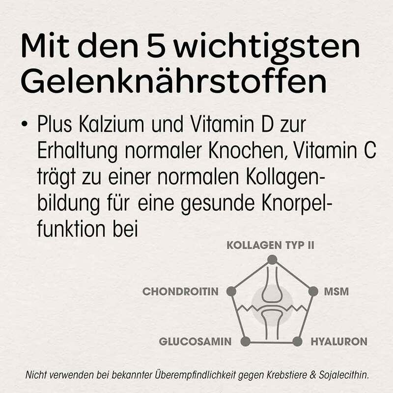 Füllstoff Cellulose, Glucosaminhydrochlorid aus dem Chitin von Krebstieren, Chondroitinsulfat-Natrium, Vitamin C, Kollagenhydrolysat (Ursprung: Huhn), Vitamin E, Natriumselenat, Füllstoff Calciumcarbonat, Methylsulfonylmethan (MSM), Überzugsmittel Hydroxypropylmethylcellulose, Füllstoff Isomalt, Überzugsmittel Schellack, modifizierte Stärke, Trennmittel Siliciumdioxid und Magnesiumsalze der Speisefettsäuren, Füllstoff Calciumphosphate, Mangansulfat, Füllstoff Natrium-Carboxymethylcellulose, Vitamin D3.