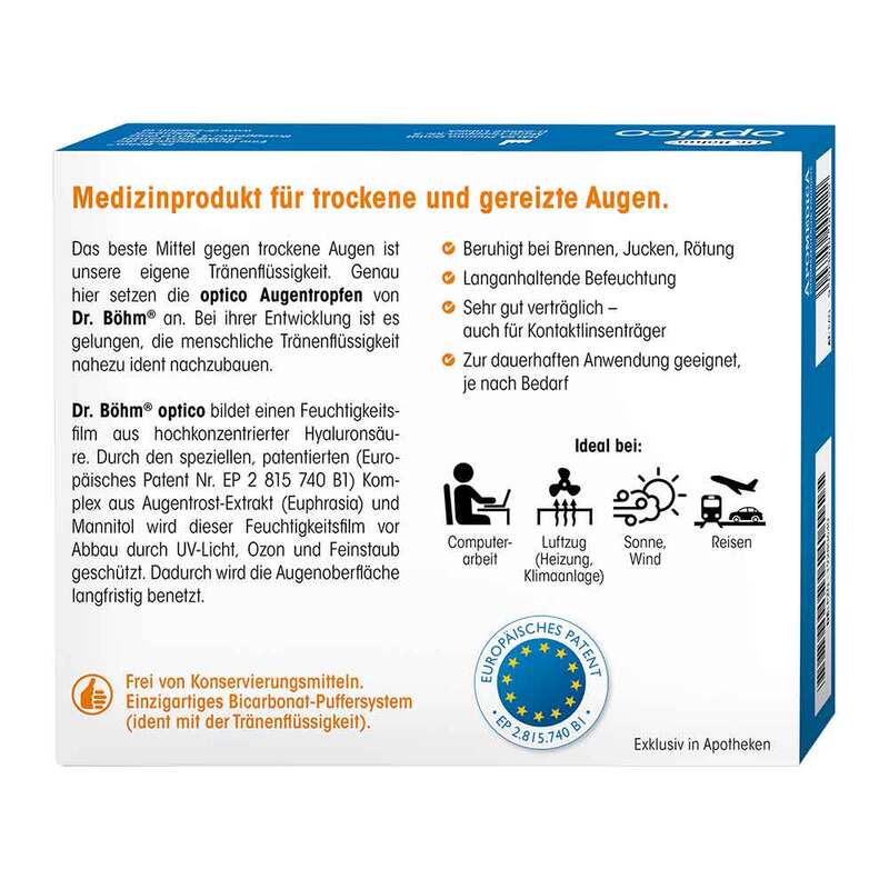 Dr. Böhm® optico ist frei von Konservierungsmitteln und kann daher bedenkenlos auch längerfristig verwendet werden. Weil die physiologische Zusammensetzung von Dr. Böhm optico der natürlichen Tränenflüssigkeit entspricht, ist es auch für Träger von weichen und harten Kontaktlinsen besonders geeignet.