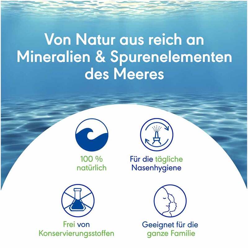 Zusammensetzung: Meerwasser 28 %, gereinigtes Wasser 72 % (1 ml Lösung enthält 0,28 ml Meerwasser), entspricht 0,9 % Natriumchlorid (NaCl).