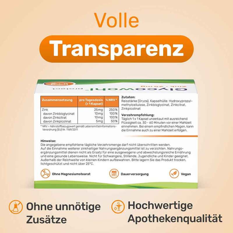 Die angegebene empfohlene tägliche Verzehrsmenge darf nicht überschritten werden. Auf die Einnahme weiterer zinkhaltiger Nahrungsergänzungsmittel ist zu verzichten. Nahrungsergänzungsmittel dienen nicht als Ersatz für eine ausgewogene und abwechslungsreiche Ernährung und eine gesunde Lebensweise.