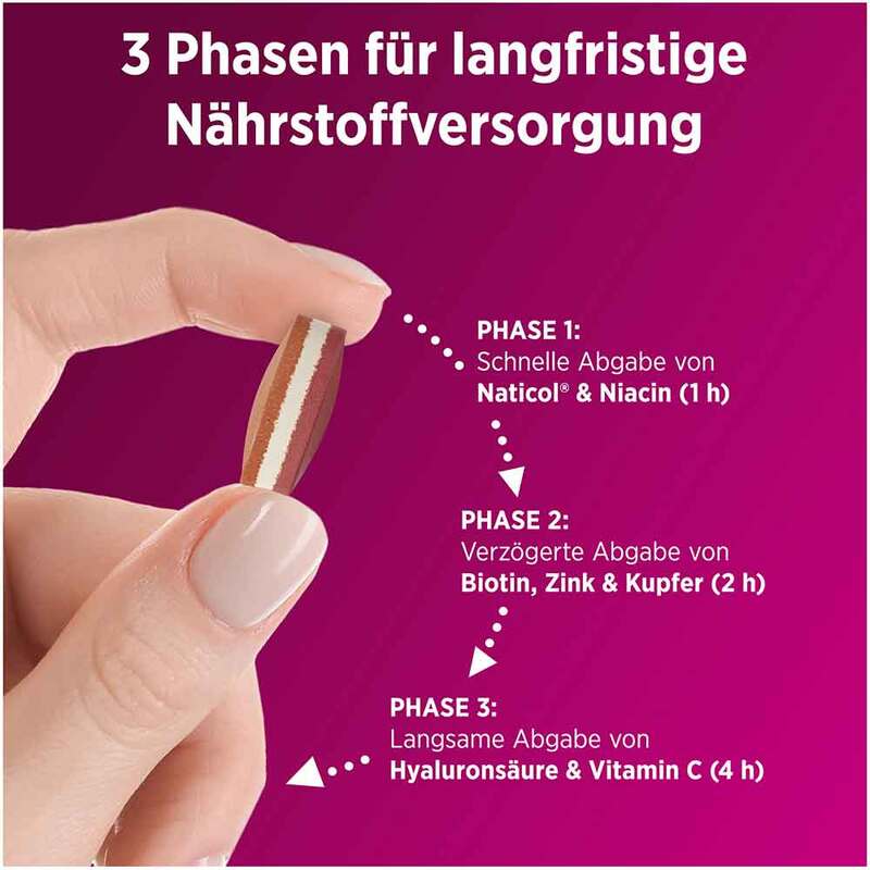 * Biotin trägt zur Erhaltung normaler Haare bei, Biotin trägt zur Erhaltung normaler Haut bei, Kupfer trägt zur Erhaltung von normalem Bindegewebe bei, Kupfer trägt zu einer normalen Haarpigmentierung bei, Kupfer trägt zu einer normalen Hautpigmentierung bei, Kupfer trägt dazu bei, die Zellen vor oxidativem Stress zu schützen, Niacin trägt zur Erhaltung normaler Haut bei, Vitamin C trägt zu einer normalen Kollagenbildung für eine normale Funktion der Knochen, Vitamin C trägt zu einer normalen Kollagenbildung für eine normale Knorpelfunktion bei, Vitamin C trägt zu einer normalen Kollagenbildung für eine normale Funktion des Zahnfleisches bei, Vitamin C trägt zu einer normalen Kollagenbildung für eine normale Funktion der Haut bei, Vitamin C trägt zu einer normalen Kollagenbildung für eine normale Funktion der Zähne bei, Vitamin C trägt dazu bei, die Zellen vor oxidativem Stress zu schützen.