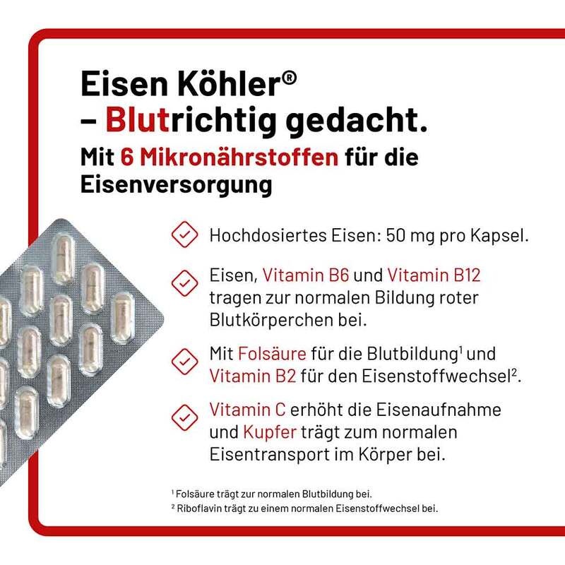 Eisen Köhler® bietet eine hochwertige Kombination aus 50 mg Eisen und sechs sorgfältig abgestimmten Mikronährstoffen wie Vitamin C, bestimmten B-Vitaminen und Kupfer. Diese Formulierung wurde speziell entwickelt, um die Aufnahme und den Transport von Eisen sowie die Bildung von roten Blutkörperchen im Körper zu unterstützen* und dadurch eine wertvolle Ergänzung zur täglichen Ernährung zu bieten.