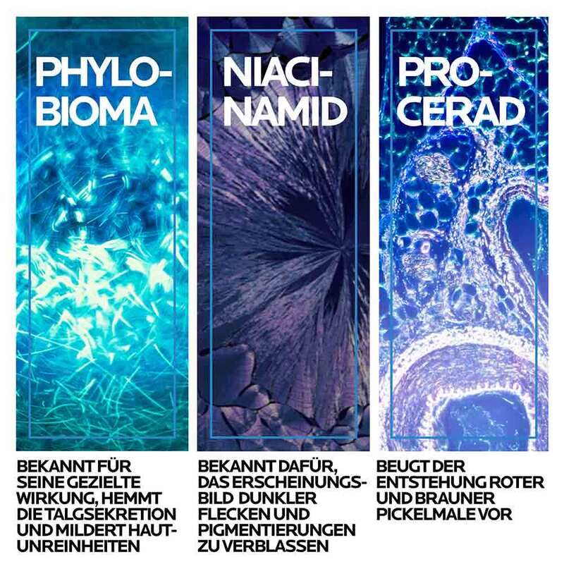 Der neue Wirkstoff Phylobioma mildert die Überproduktion von Talg und glättet das Hautbild sowie korrigiert wissenschaftlich bestätigt Hautunreinheiten. Zusätzlich hilft Niacinamid dabei, das Erscheinungsbild dunkler Flecken und Pigmentierungen zu verblassen.