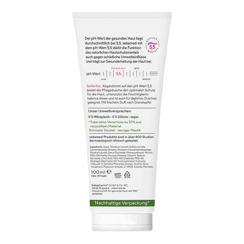 Abgestimmt auf den pH-Wert 5,5 bietet die Pflegedusche den optimalen Schutz für die Haut, unterstützt die Feuchtigkeitsbalance dieser und ist auch für tägliches Duschen geeignet. Die Pflegedusche ist mit frischem Duft nach Granatapfel.