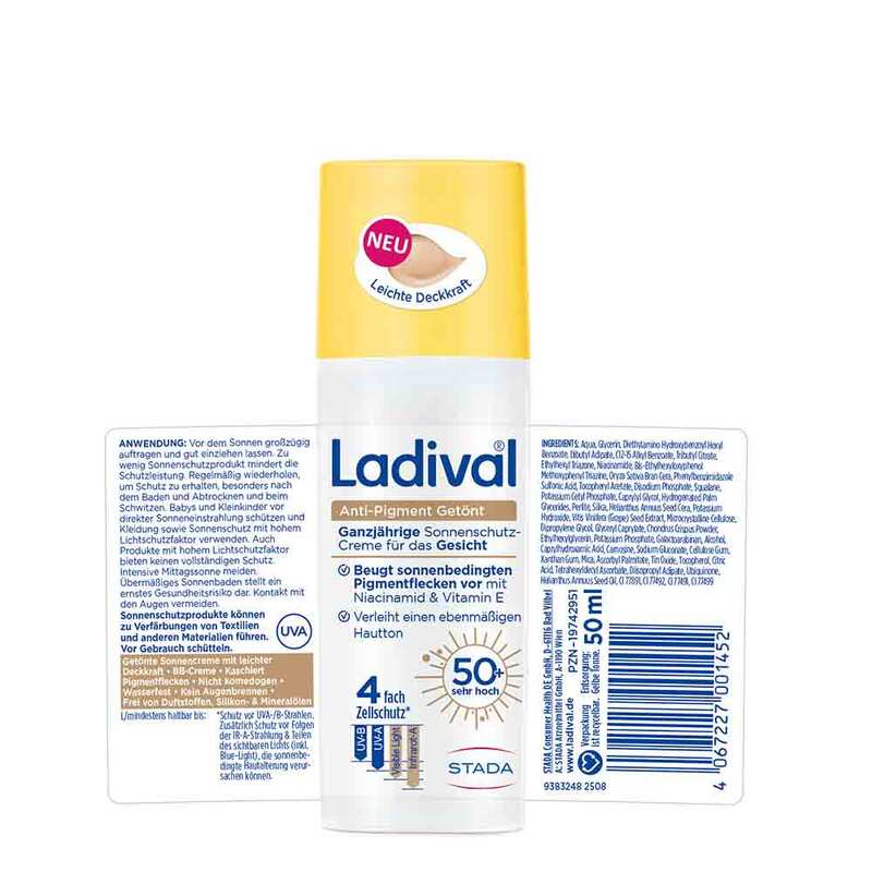 Die Ladival® Anti-Pigment Getönt Sonnenschutz-Creme LSF 50+ wurde speziell für mittlere Hauttöne entwickelt, die zu Pigmentflecken neigt. Die sanft getönte Formel kaschiert sichtbare Hautunregelmäßigkeiten und verleiht sofort ein ebenmäßiges, natürliches Hautbild.