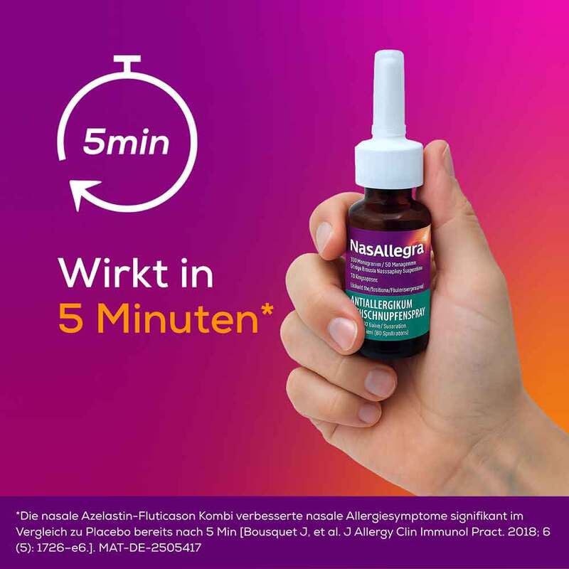 NasAllegra® 137 Mikrogramm/50 Mikrogramm pro Sprühstoß, Nasenspray, Suspension. Wirkstoffe: Azelastinhydrochlorid und Fluticasonpropionat. Warnhinweis: Enthält Benzalkoniumchlorid. Anwendungsgebiet: Linderung der Symptome der mittelschweren bis schweren saisonalen allergischen Rhinitis (Heuschnupfen) bei Erwachsenen, nach ärztlicher Erstdiagnose und wenn die Anwendung eines intranasalen Antihistaminikums oder Kortikosteroids allein nicht ausreicht. Apothekenpflichtig. Zu Risiken und Nebenwirkungen lesen Sie die Packungsbeilage und fragen Sie Ihre Ärztin, Ihren Arzt oder in Ihrer Apotheke. A. Nattermann & Cie. GmbH, Brüningstraße 50, 65929 Frankfurt am Main. Stand: Oktober 2025.