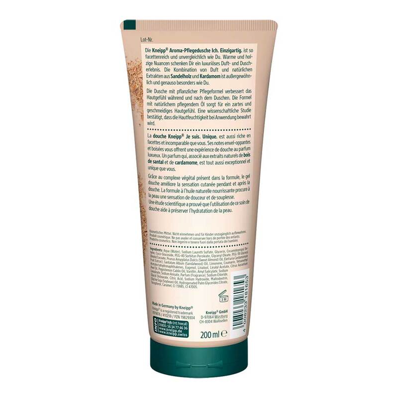 Die Kneipp Aroma-Pflegedusche Ich. Einzigartig ist so facettenreich und unvergleichlich wie Sie. Warme und holzige Nuancen schenken Ihnen ein luxuriöses Duft- und Duscherlebnis. Die Kombination von Duft und natürlichen Extrakten aus Sandelholz und Kardamom ist außergewöhnlich und genauso besonders wie Sie.