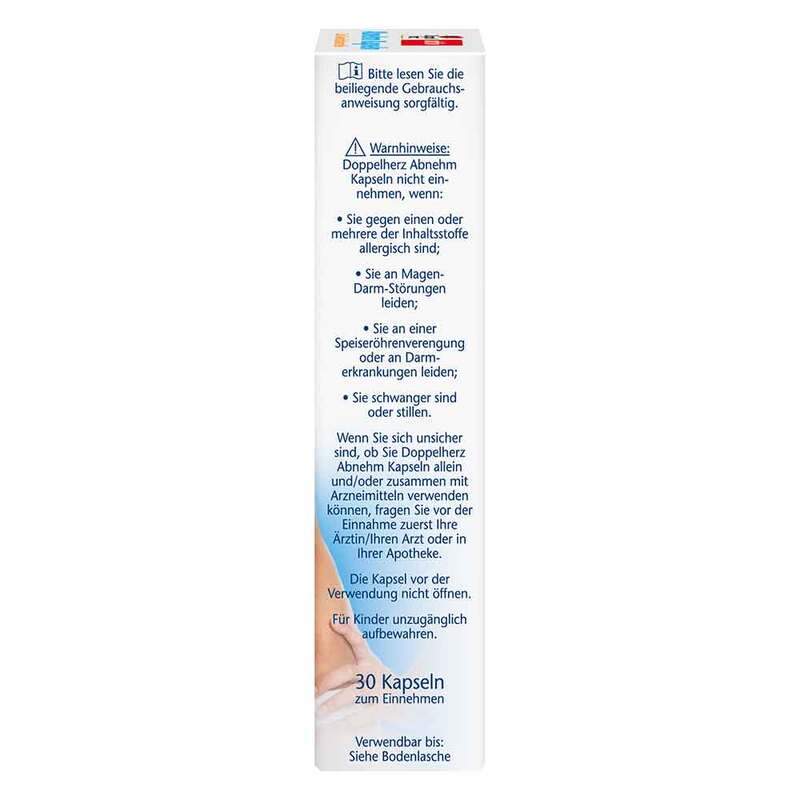 Doppelherz Abnehm Kapseln dürfen nicht in der Schwangerschaft oder Stillzeit eingenommen werden. Das Produkt ist nicht für Kinder geeignet.