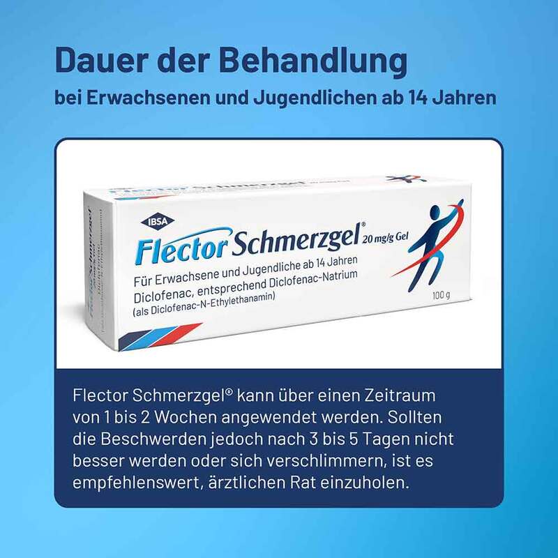 Die Dauer der Anwendung richtet sich nach dem Anwendungsgebiet und dem Ansprechen des Patienten/der Patientin auf die Behandlung. Flector® Schmerzgel sollte ohne ärztlichen Rat nicht länger als 1-2 Wochen angewendet werden. Suchen Sie einen Arzt/eine Ärztin auf, wenn sich die Beschwerden verschlimmern oder sich nach 3-5 Tagen nicht gebessert haben. Jugendliche ab 14 Jahren: Wenn dieses Arzneimittel länger als 7 Tage zur Schmerzbehandlung erforderlich ist oder wenn sich die Symptome verschlechtern, wird dem Patienten/der Patientin bzw. den Eltern geraten, einen Arzt/eine Ärztin aufzusuchen.
