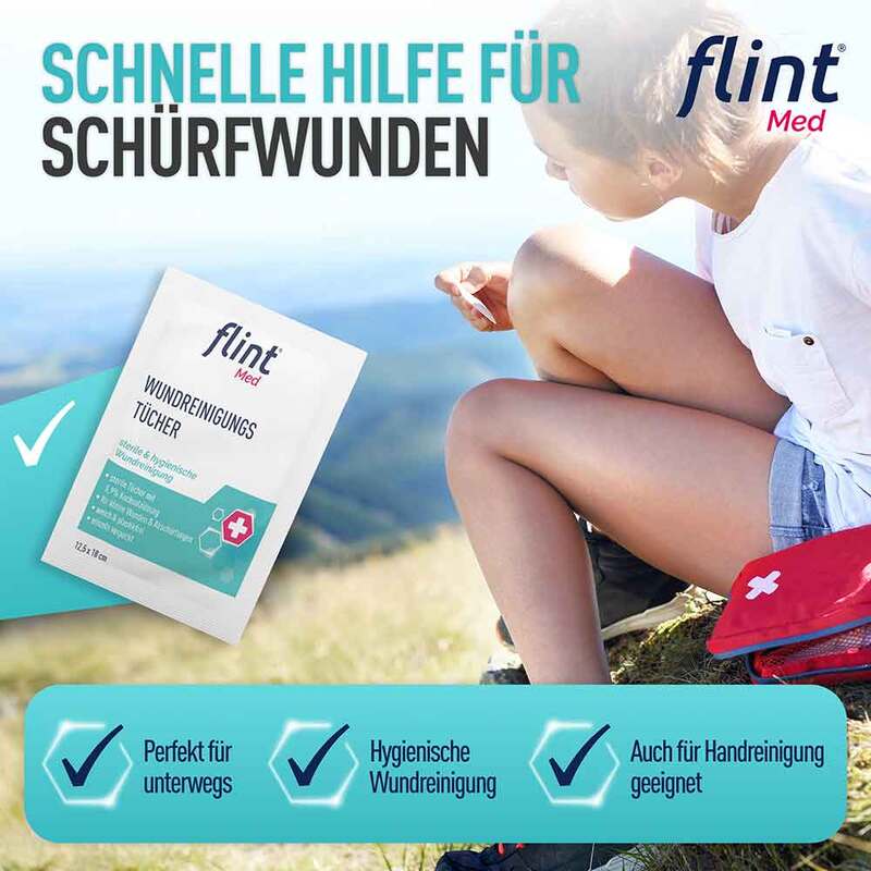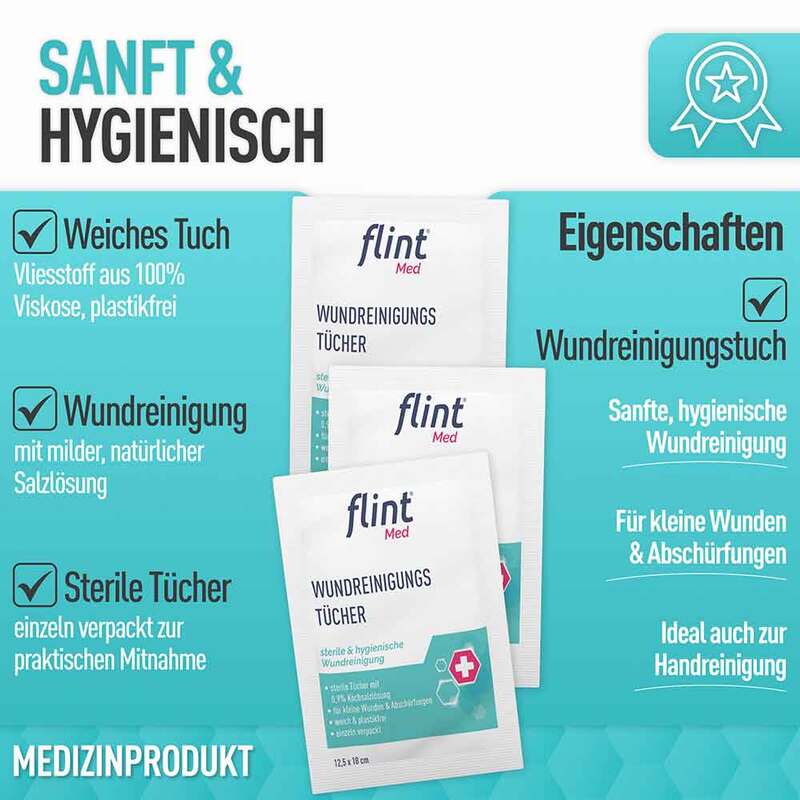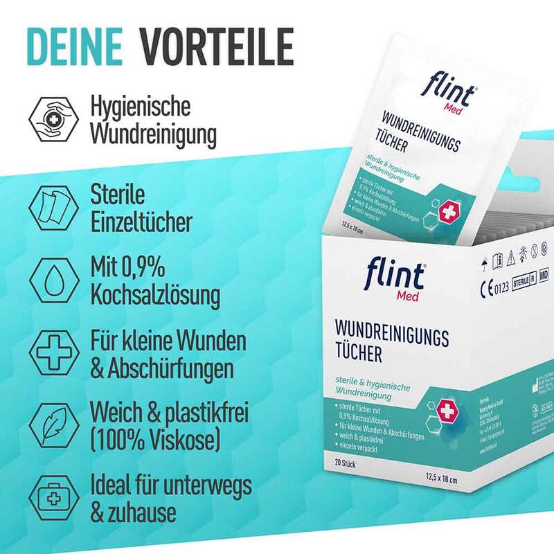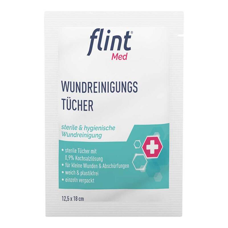 flint Med® Wundreinigungstücher sind sterile Wundreinigungstücher mit 0,9% Kochsalzlösung und bieten eine sanfte und hygienische Reinigung kleinerer Wunden und Abschürfungen. Sie eignen sich zudem ideal zur Reinigung der Hände vor der Versorgung einer kleinen Verletzung. Das Wundreinigungstuch ist mit einer milden, natürlichen (Koch-)Salzlösung, die nicht antibakteriell wirkt, getränkt.
