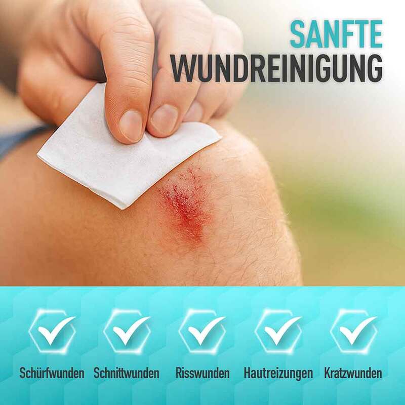 - Einfache Anwendung – jederzeit einsatzbereit: Sachet öffnen, von der Wundmitte nach außen reinigen und anschließend das Tuch entsorgen.