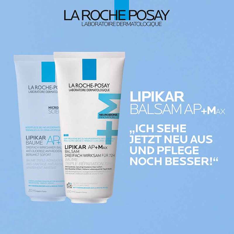 La Roche Posay Lipikar Balsam AP+Max spendet Feuchtigkeit und beruhigt extrem trockene und zu Neurodermitis und Allergien neigende Haut bei Babys, Kindern und Erwachsenen sofort nach dem Auftragen – ohne zu fetten oder zu kleben. Dank der neuen, 3-fach-wirksamen Formel mit dem innovativen Wirkkomplex Neurobioma wirkt der Lipikar Balsam jetzt sogar bis zu 72h.