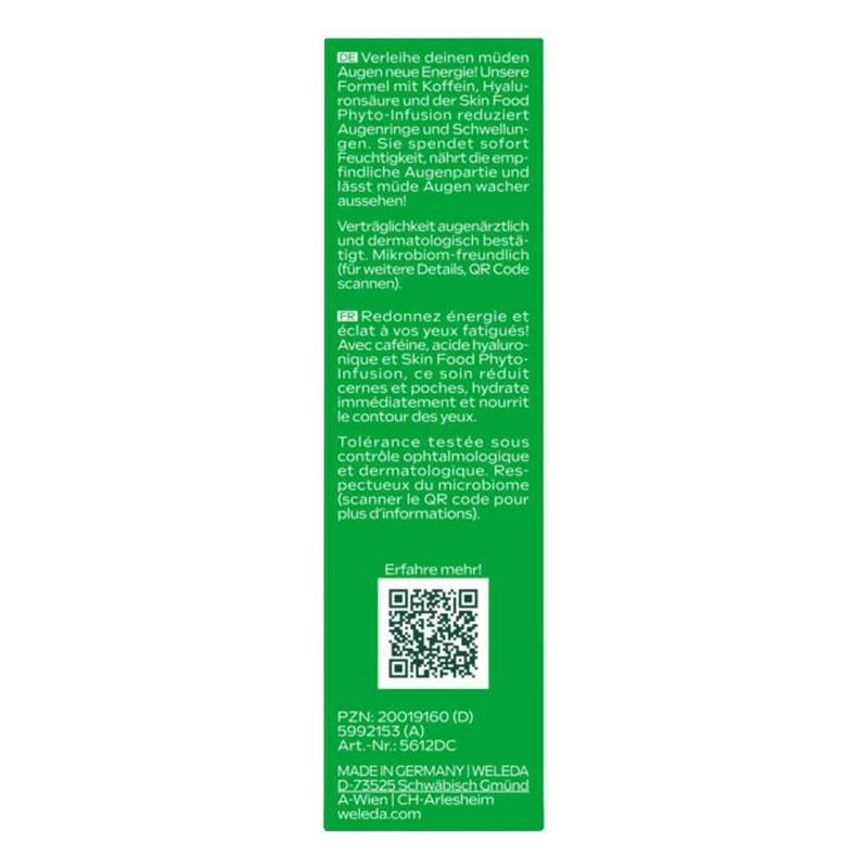 Verleihe deinen müden Augen einen echten Wake-up-Moment mit unserer neuen nährenden Super Augencreme! Sie powert mit Koffein, Hyaluronsäure und der Skin Food Phyto-Infusion aus 100 % natürlichen Pflanzen-Extrakten von Rosmarin, Calendula, Kamille und Stiefmütterchen.