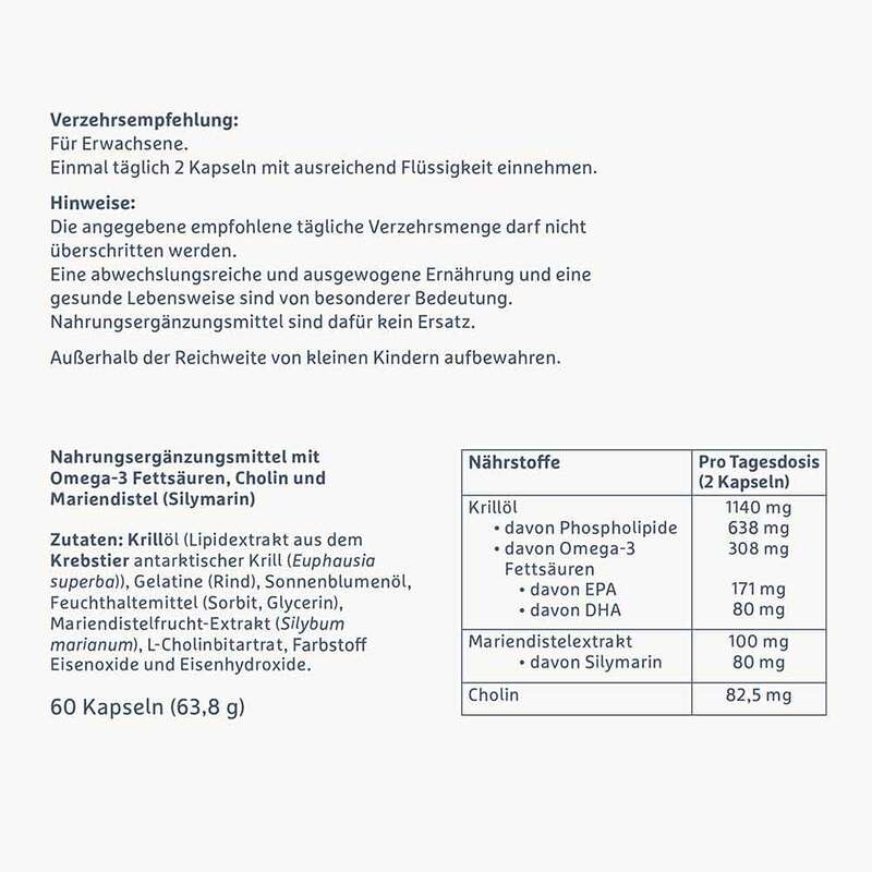 Krillöl (Lipidextrakt aus dem Krebstier antarktischer Krill (Euphausia superba)), Gelatine (Rind), Sonnenblumenöl, Feuchthaltemittel (Sorbit, Glycerin), Mariendistelfrucht-Extrakt (Silybum marianum), L-Cholinbitartrat, Farbstoff Eisenoxide und Eisenhydroxide