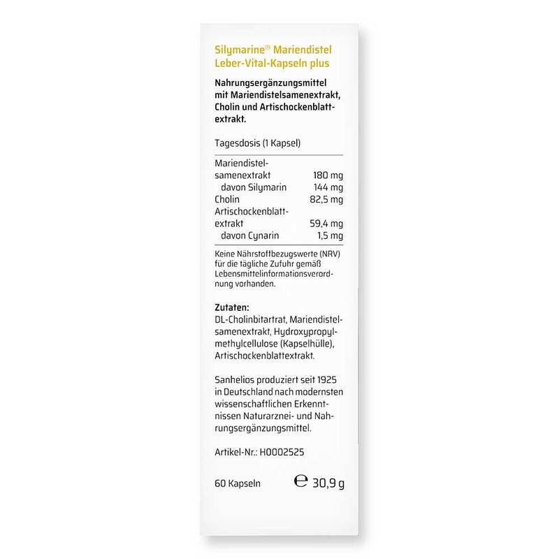 Sanhelios Silymarine® Mariendistel Kapseln enthalten Cholin, das zur Erhaltung einer normalen Leberfunktion beiträgt, sowie 180 mg hochwertigen Mariendistelextrakt und 59 mg Artischockenblattextrakt.*