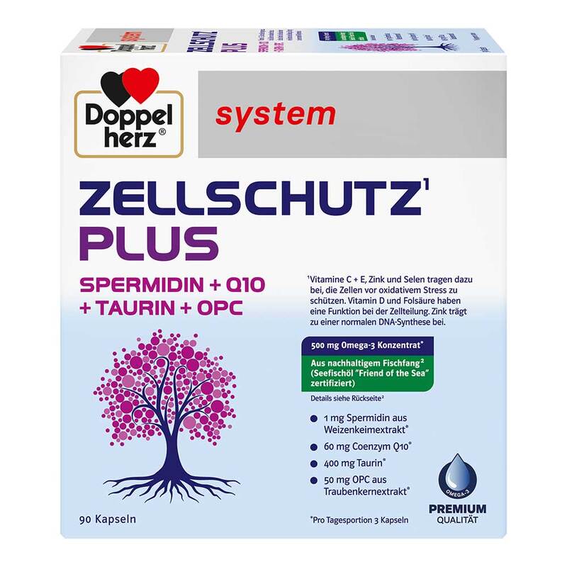 Doppelherz system ZELLSCHUTZ PLUS enthält eine Kombination aus wichtigen Mikronährstoffen für den Zellschutz. Vitamin E, Vitamin C, Vitamin B2, Zink, Kupfer und Selen tragen dazu bei, die Zellen vor oxidativem Stress zu schützen. Zusätzlich enthalten: Spermidin aus Weizenkeimextrakt.