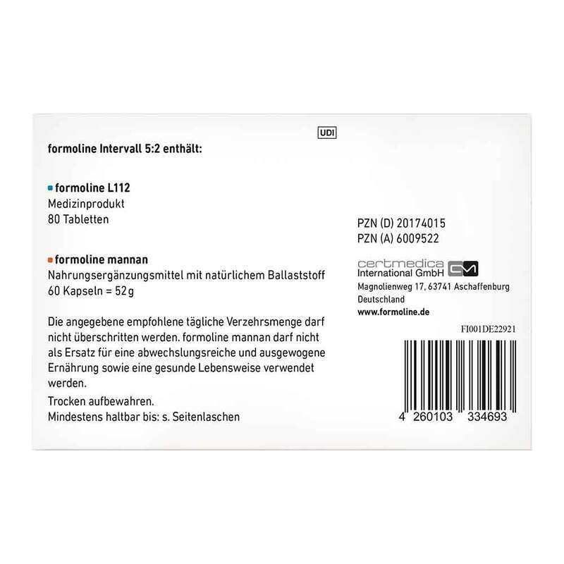 Die Formoline Kombipackung Intervall 5:2 ist ideal für die Unterstützung beim Abnehmen durch Intervallfasten entwickelt worden. Sie besteht aus Formoline L112, welches zum Essen eingenommen wird, und Formoline mannan, welches an Fastentagen Anwendung findet.