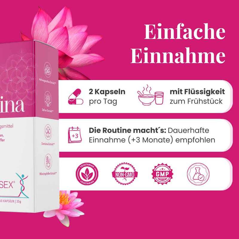- Mit Ashwagandha-, Mönchspfeffer-, Damiana-, Safran-Extrakten und Mikronährstoffen