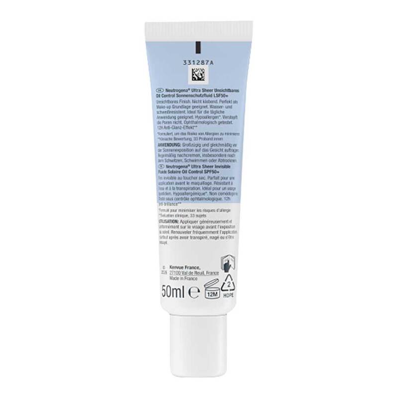 Neutrogena® Ultra Sheer Unsichtbares Oil Control Sonnenschutzfluid LSF50+ bietet dank der innovativen Helioplex SL® Technologie einen sehr hohen Breitbandschutz vor UVA-, UVB-Strahlen und sichtbarem Licht. Die Formel mit Niacinamid, Trehalose sowie Antioxidantien (Vitamin C & E) hilft, Anzeichen vorzeitiger Hautalterung durch Sonne und Umwelteinflüsse vorzubeugen.