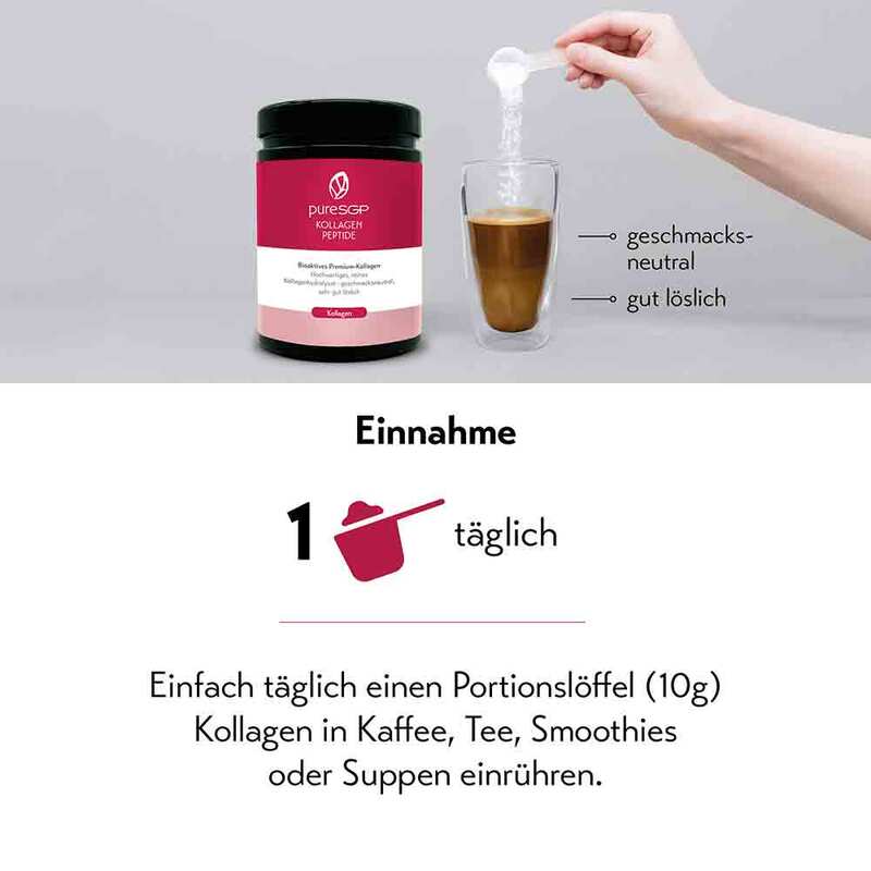 - Reines Kollagen in Apothekenqualität – pureSGP® Kollagen Peptide enthält 100 % reines Kollagenhydrolysat aus natürlichen Rohstoffen.