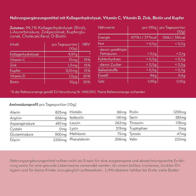99,7% Kollagenhydrolysat (Rind), L-Ascorbinsäure, Zinkpicolinat, Kupfergluconat, Cholecalciferol, D-Biotin.